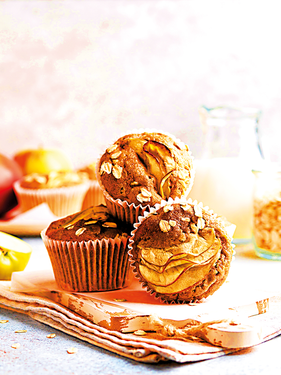 Muffiny ozdobte plátky jablek a trochou ovesných vloček. Místo nich můžete samozřejmě použít najemno nasekané ořechy.