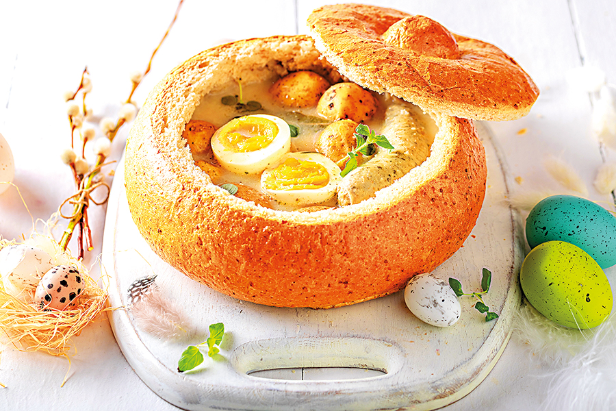 Vejce uvařte natvrdo, oloupejte a nakrájejte na půlky nebo čtvrtiny. Polévku podávejte ozdobenou vejci, například ve vydlabaném bochníku.