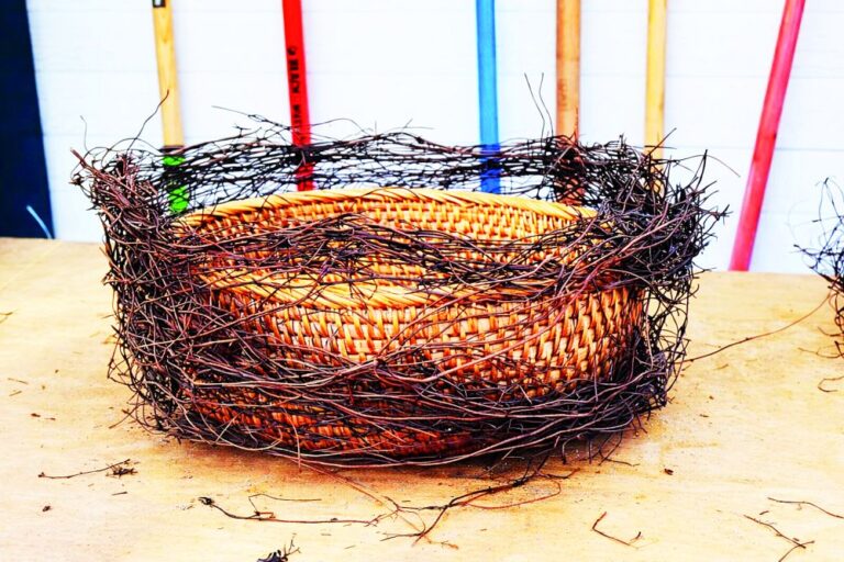 1. Kolem košíku několikrát omotejte dekorativní proutí tak, aby byl košík zcela zakrytý a nikde neprosvítal. Na několika místech proutí upevněte floristickým drátkem.