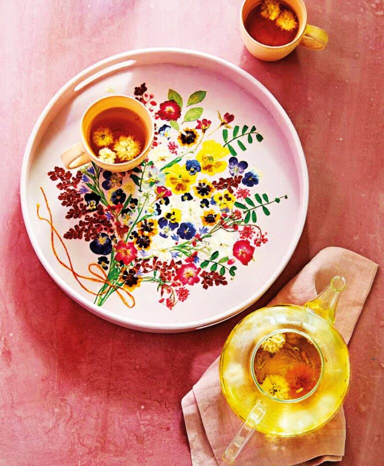 Rozložte na něj různé druhy vylisovaných sušených květů a ještě jednou je přejeďte válečkem, aby dobře přilnuly k podkladu. Poté z hmoty vyřízněte kruhy, lehce jim přehněte okraje a nechte je zcela ztvrdnout. Hotový výrobek natřete bezbarvým lakem.
