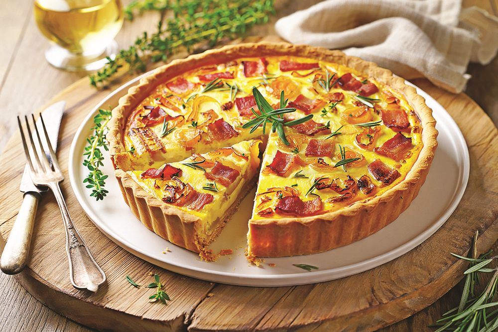 Prošlehejte 3 vejce, smetanu, 60 ml mléka, sýr, sůl a pepř. Cibuli se slaninou a tymiánem rovnoměrně rozprostřete na koláč, zalijte sýrovou směsí a pečte 25–30 minut, až je náplň zlatavá a pevná.