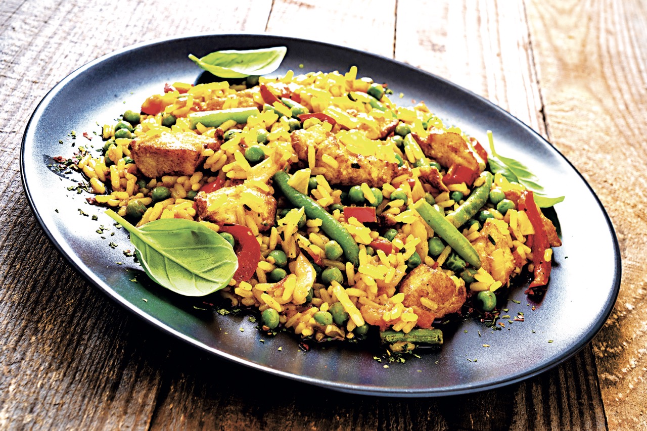Rychlá, barevná a sytá večeře, která kombinuje rýži, zeleninu a maso v jedné pánvi.