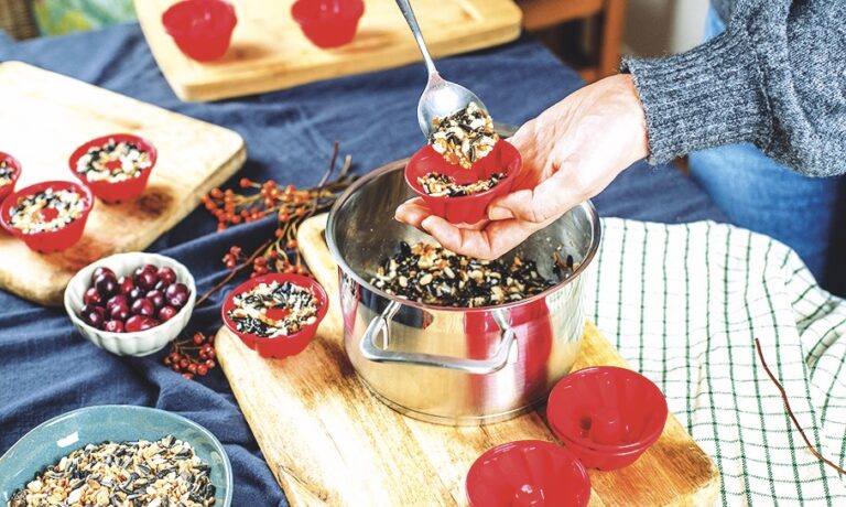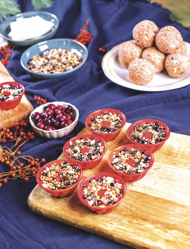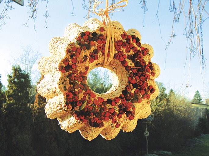 Vytvořte směs z rozmixovaných vloček nebo mouky, oříšků a žloutku. Na dno silikonové formy nasypte jeřabiny a zalijte směsí. Dejte péct na přibližně 25 minut, a efektní závěsné krmení je hotovo.