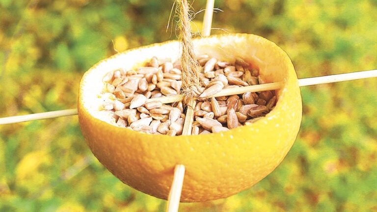 Jak jednoduché! Rozpulte pomeranč a vnitřek vydlabejte. Okraj kůry propíchejte špejlemi křížem tak, aby špejle přesahovaly alespoň patnáct centimetrů. Ptáčkům poslouží jako šikovná odpočívadla. Zavěste provázkem na strom a naplňte semeny.