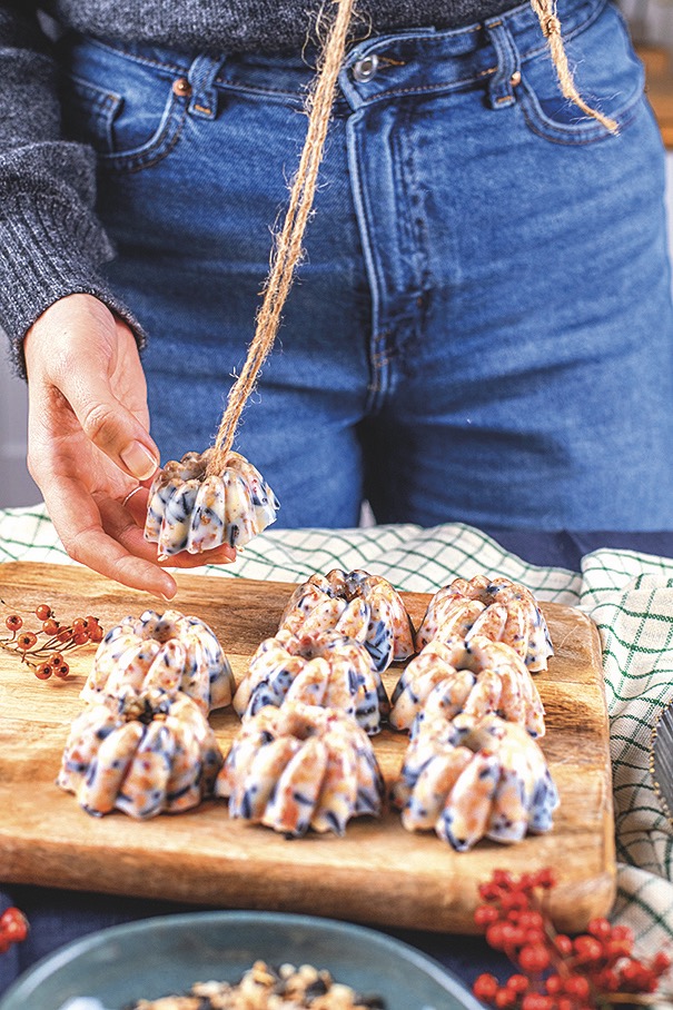 3) Tuk pomalu rozehřejte v kastrůlku, pak ho odstavte ze sporáku a vmíchejte semena. Nechte mírně zchladnout. Potom naplňte formičky a nechte zatvrdnout v lednici. Vyjměte z forem a středem provlékněte provázek na zavěšení.
