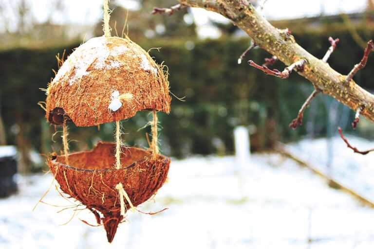 Chcete uchránit krmení před sněhem a deštěm? Vyrobte takovéto závěsné krmítko z kokosového ořechu. Do obou částí vydlabané skořápky provrtejte po okrajích dírky a propojte provázky podle obrázku. Vznikne tak roztomilá, ale hlavně funkční stříška.