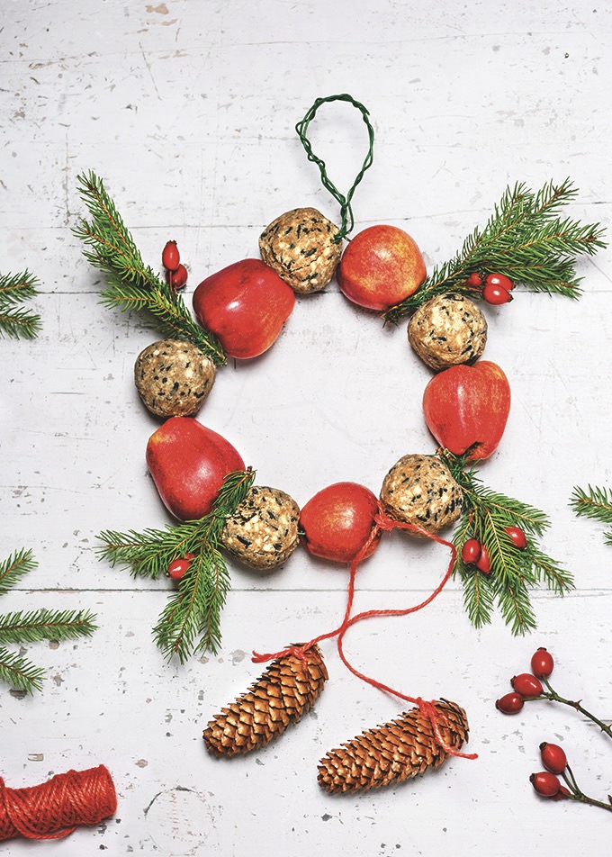 Spolu s jablky pak navlékněte na drátek, dozdobte větvičkami a šípky a sepněte do kruhu. Vznikne přenádherné krmítko v podobě věnce, které bude i dekorací.