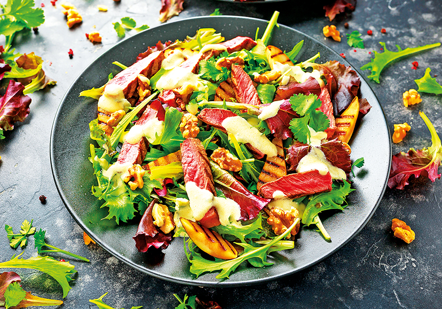 Na talíř rozprostřete směs listových salátů, přidejte opečené hrušky, plátky kachního masa a posypejte vlašskými ořechy.