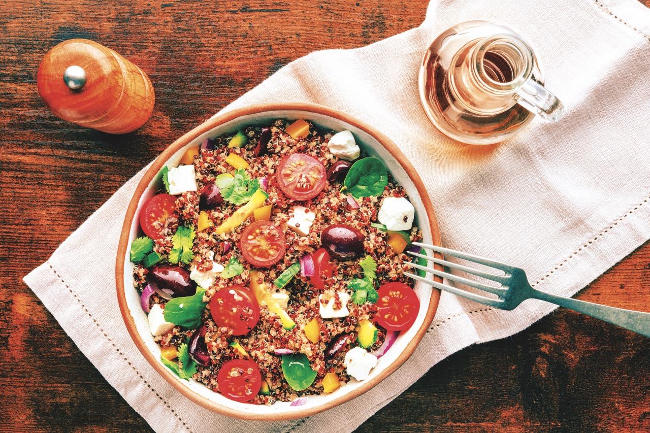 V míse smíchejte quinou se zeleninou, přidejte nadrobenou fetu, zakápněte olivovým olejem a citronem a dochuťte solí i pepřem.