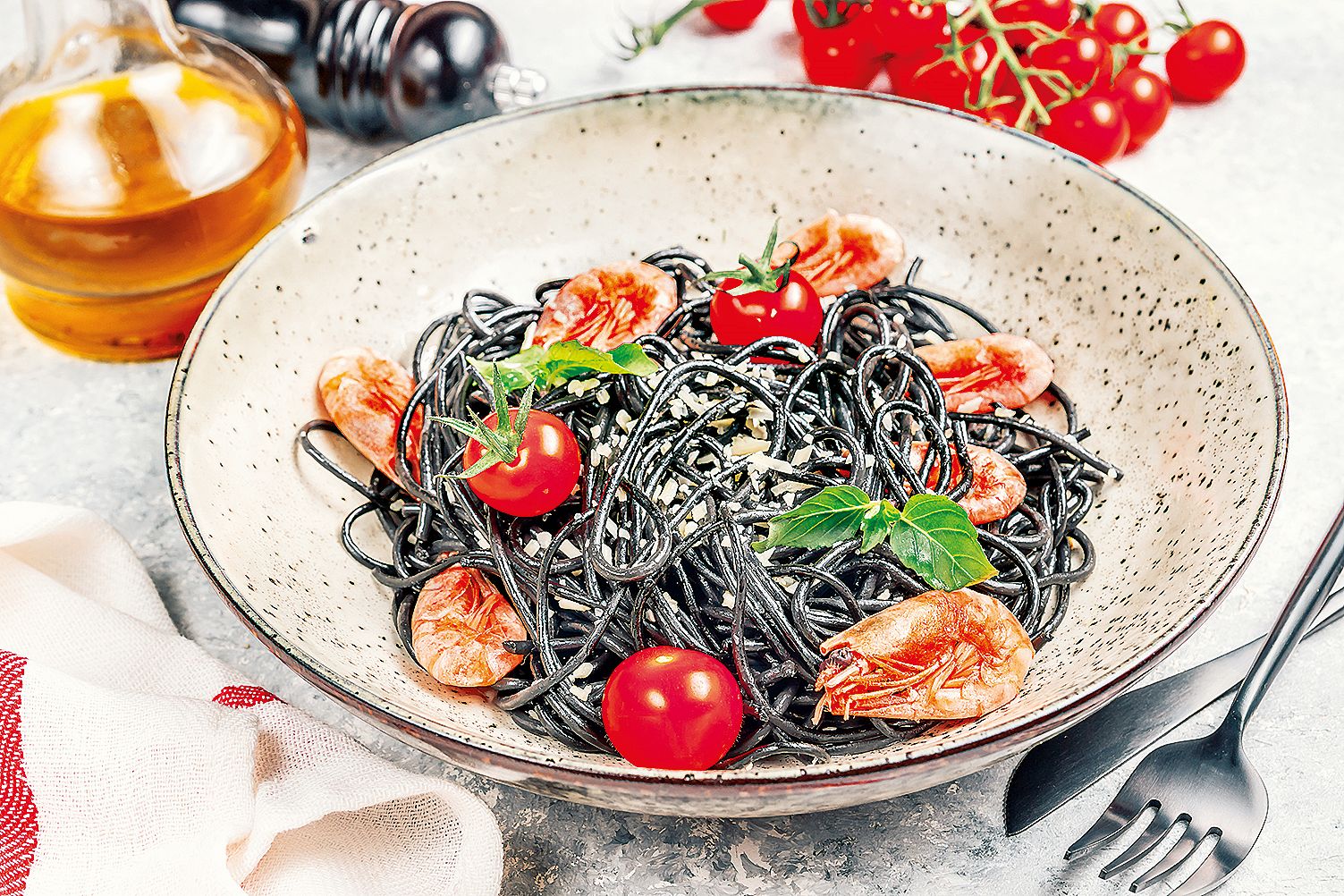 Klasické těstoviny ze semoliny obarvené sépiovým inkoustem chutnají lehce po moři a navíc jsou opravdu velmi efektní na pohled.