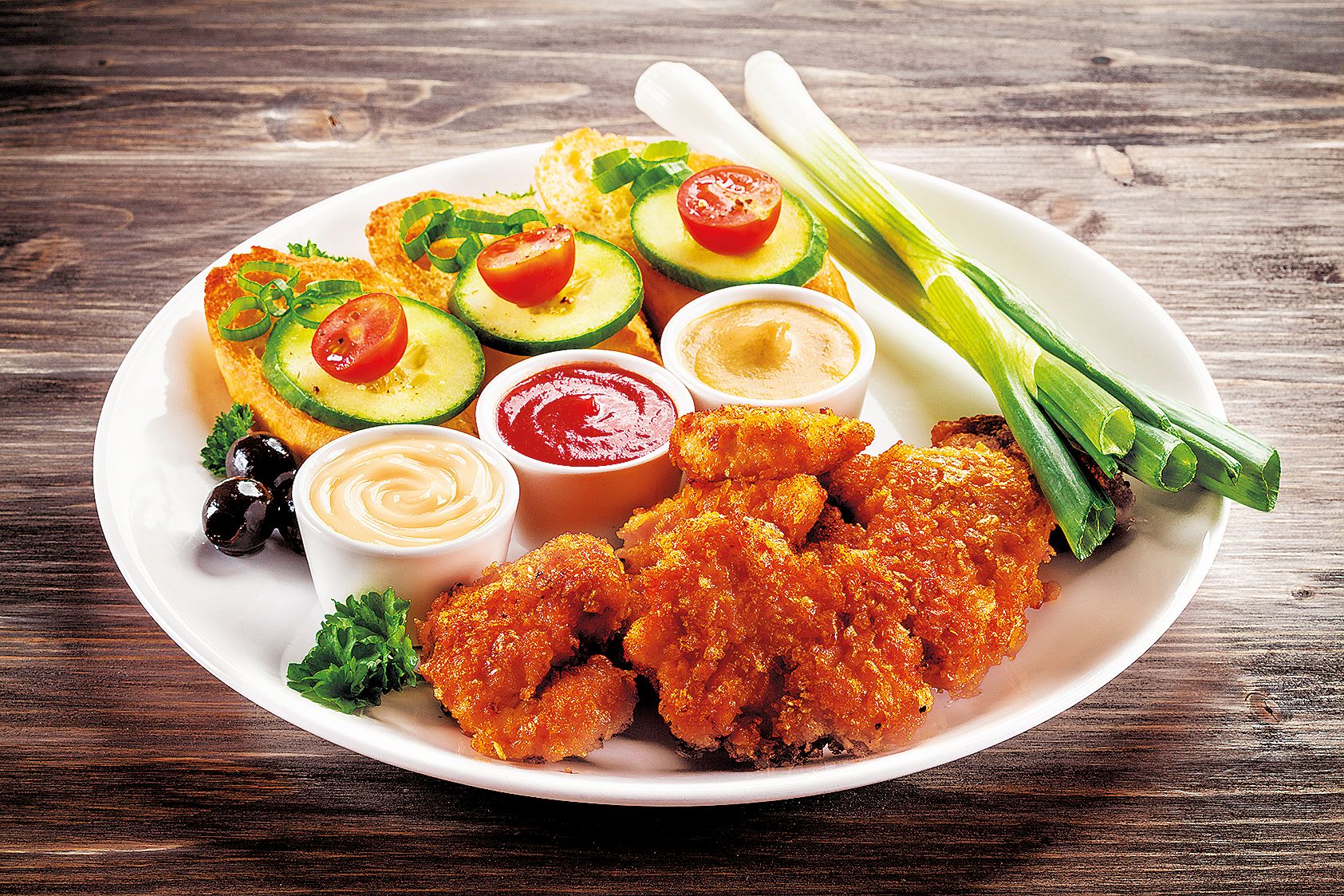 3. Vkládejte postupně maso do vyšší vrstvy rozpáleného oleje v pánvi a smažte v 3–4 minuty dozlatova. Podávejte s citronem, případně s různými dipy, zeleninou či pečivem.