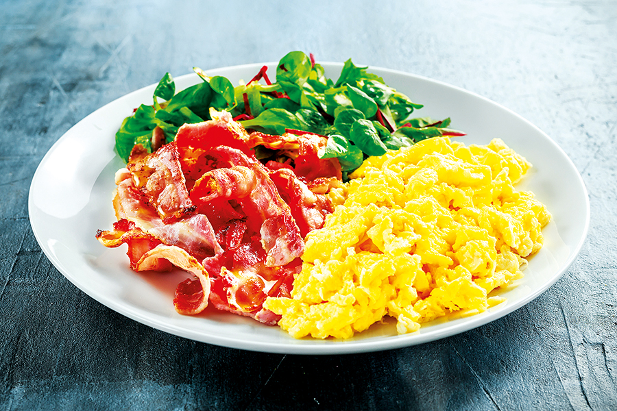 Míchaná vejce podávejte společně s medovou slaninou a porcí čerstvého salátu ochuceného balzamikem.