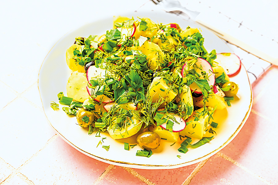 Zakápněte olivovým olejem a citronovou šťávou, osolte, opepřete a jemně promíchejte, aby se brambory nerozpadly.