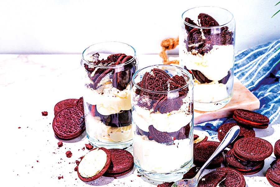 Oreo sušenky nahrubo nalámejte nebo lehce rozdrťte. Případně je můžete nahrubo rozmixovat v mixéru. Pár kousků si nechte na ozdobu.