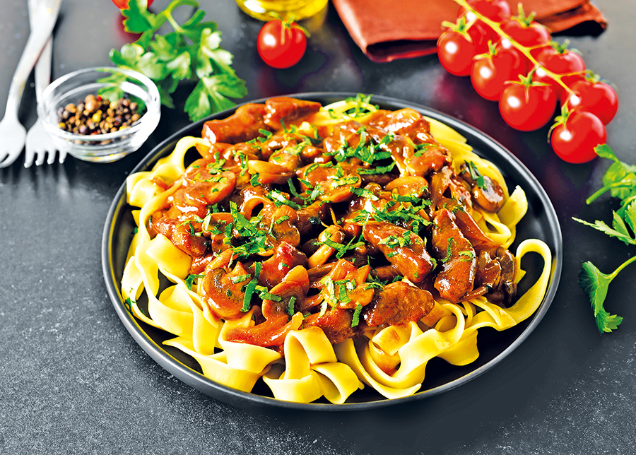 Mezitím si podle návodu uvedeného na obalu uvařte těstoviny, promíchejte je s ragú a na ozdobu posypejte petrželkou.