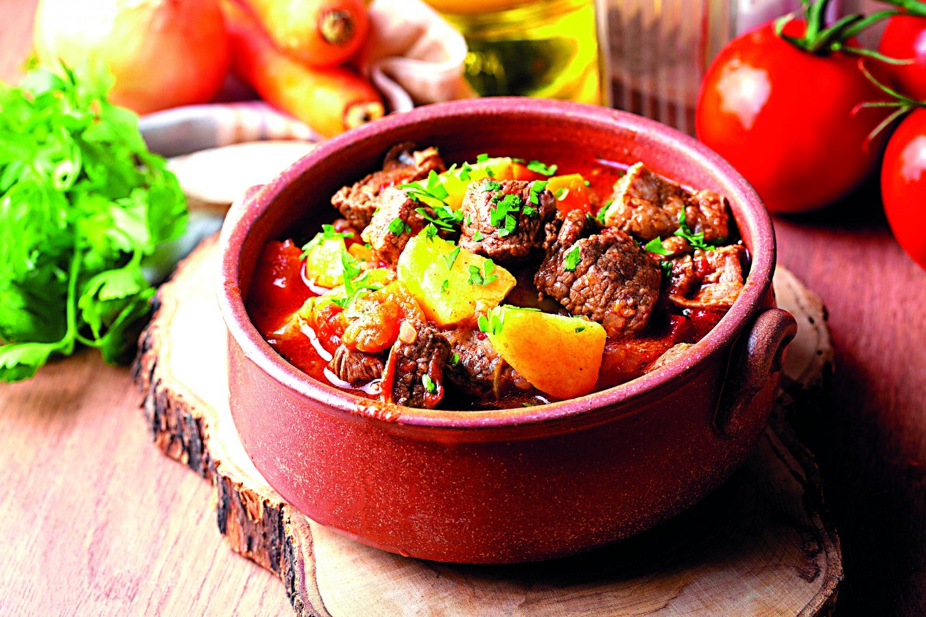 Duste zvolna, dokud maso nezměkne. Poté přidejte protlak a brambory nakrájené na kostky a vařte, až se část brambor rozvaří a zahustí omáčku. Na závěr dolaďte pepřem a podávejte s chlebem.