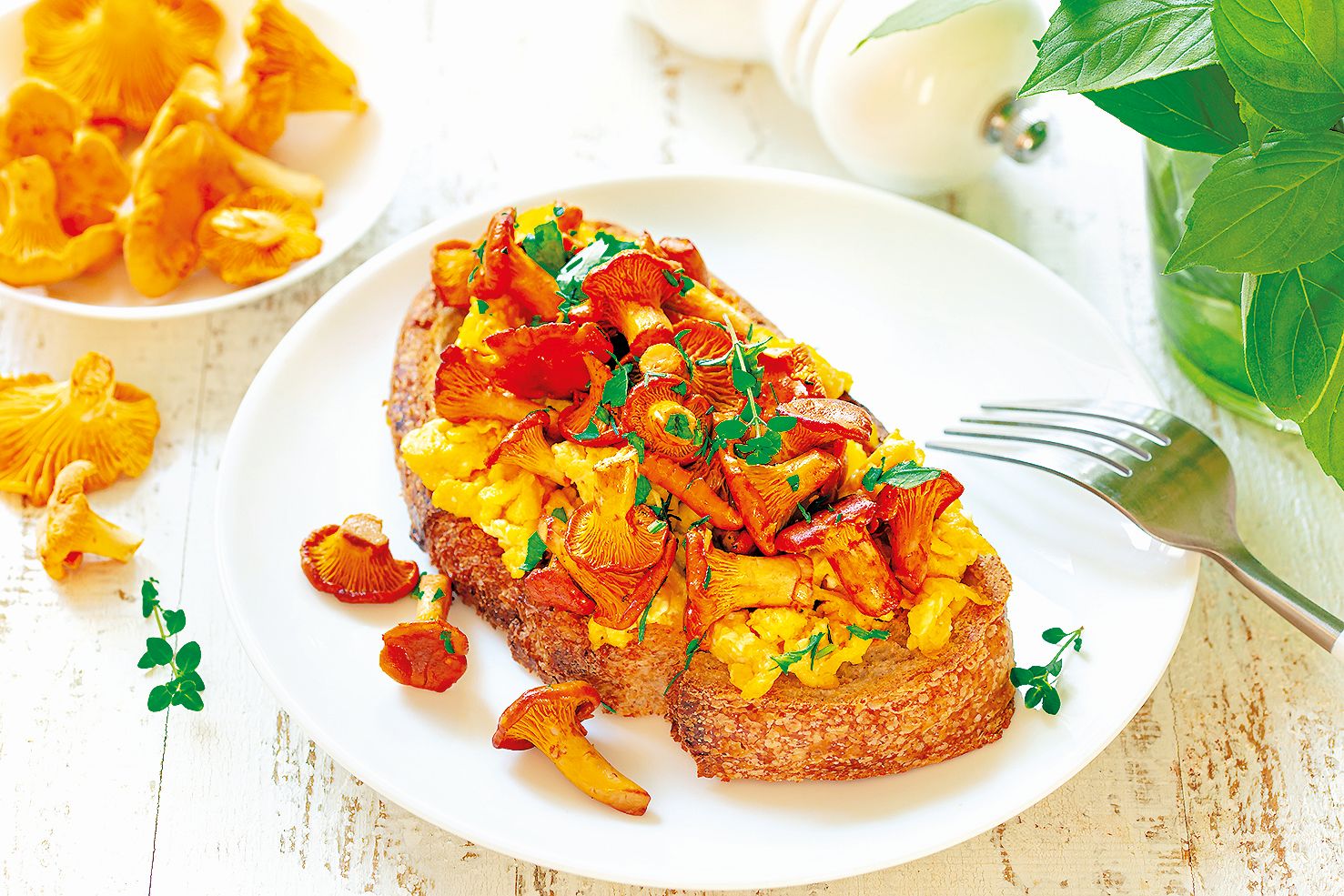 Chutné tousty s míchanými vejci a houbami jsou lahůdkou, která nezklame. Vhodné jsou lišky, můžete ale použít i jiné drobné houby nebo nakrájené žampiony.