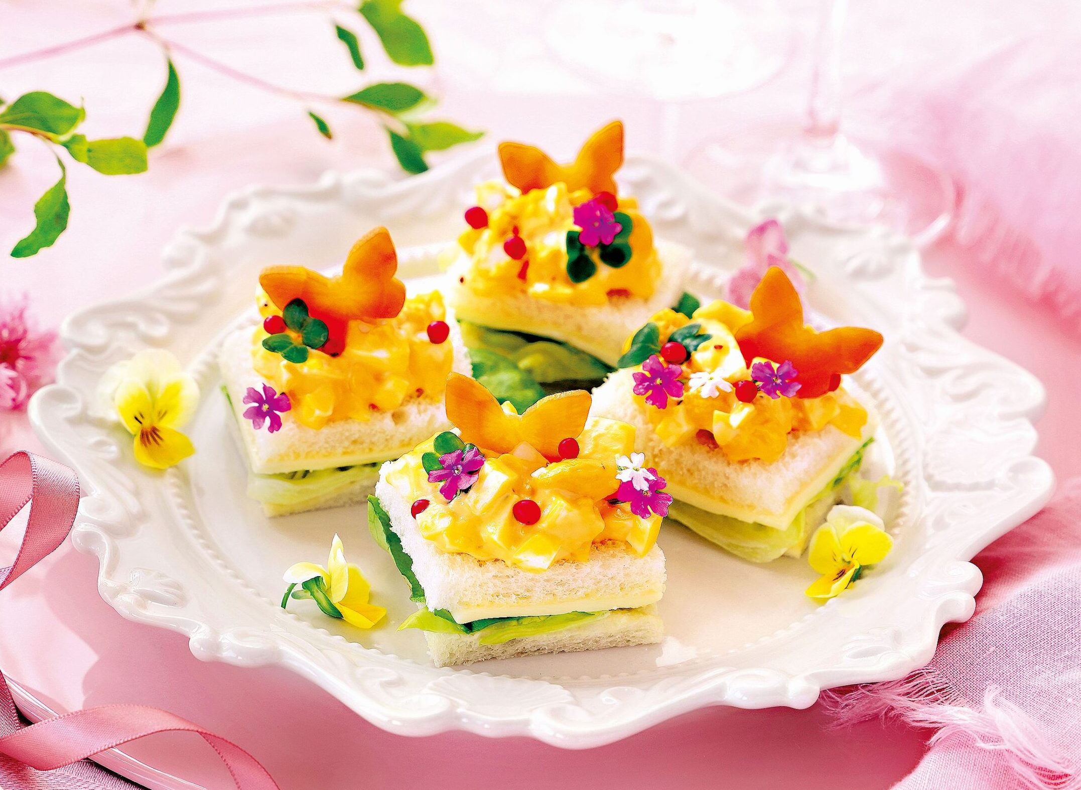 3. Na vrch sendvičů dejte vajíčkovou pomazánku, ozdobte ji granátovými zrnky, snítkami řeřichy a jedlými květy. Z dužiny melounu vykrojte tvořítkem tvar motýlka (nebo kytičky), zapíchněte ho do pomazánky a podávejte.
