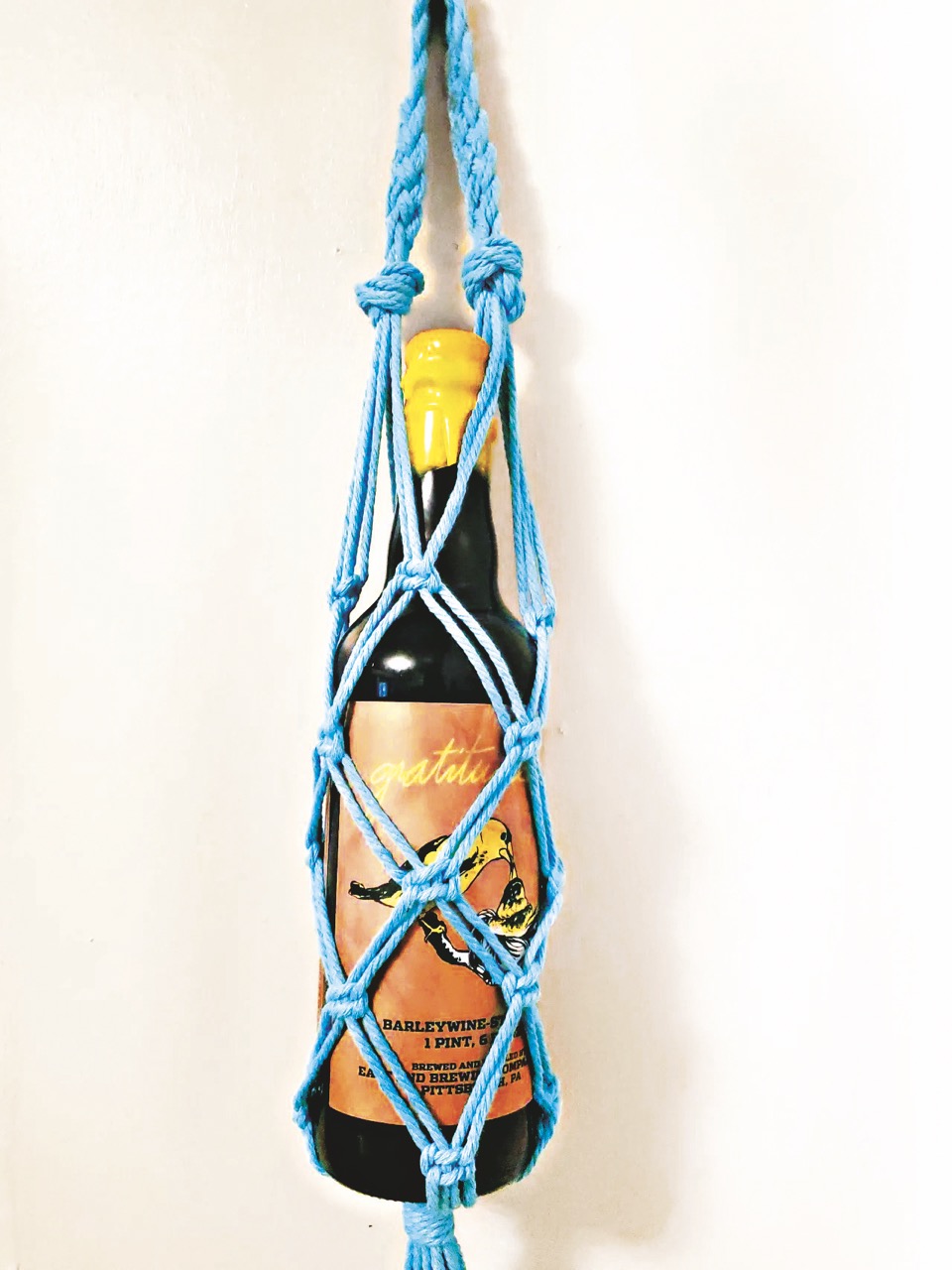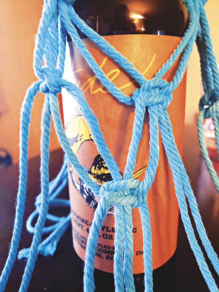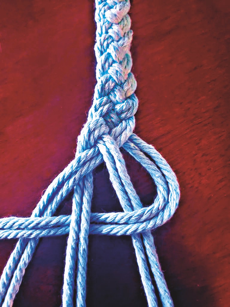 3) Ten upevněte na stole a splétejte jednotlivé prameny podle obrázku. Až dosáhnete délky lahve (hrdlo by měla mít u prvního horního uzlu), svažte provázky i dole.