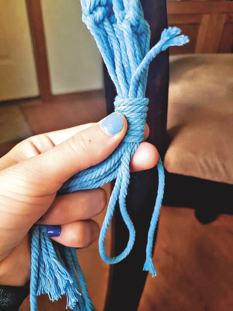 2) Připravte si silnější provázek veselé barvy a můžete se pustit do výroby. Lanko nastříhejte na osm stejně dlouhých částí po 30 centimetrech. Čtyři a čtyři provázky svažte uzlíkem asi patnáct centimetrů od konce. Kratší části svažte do copánků a posléze obě části do jednoho uzlu.