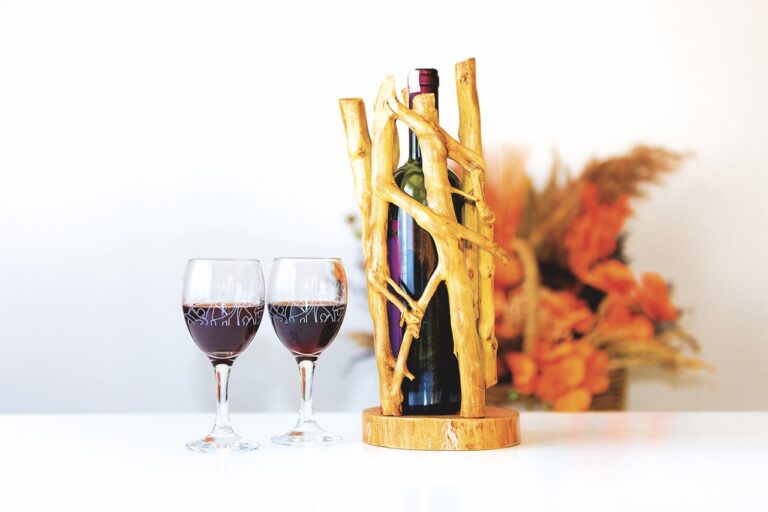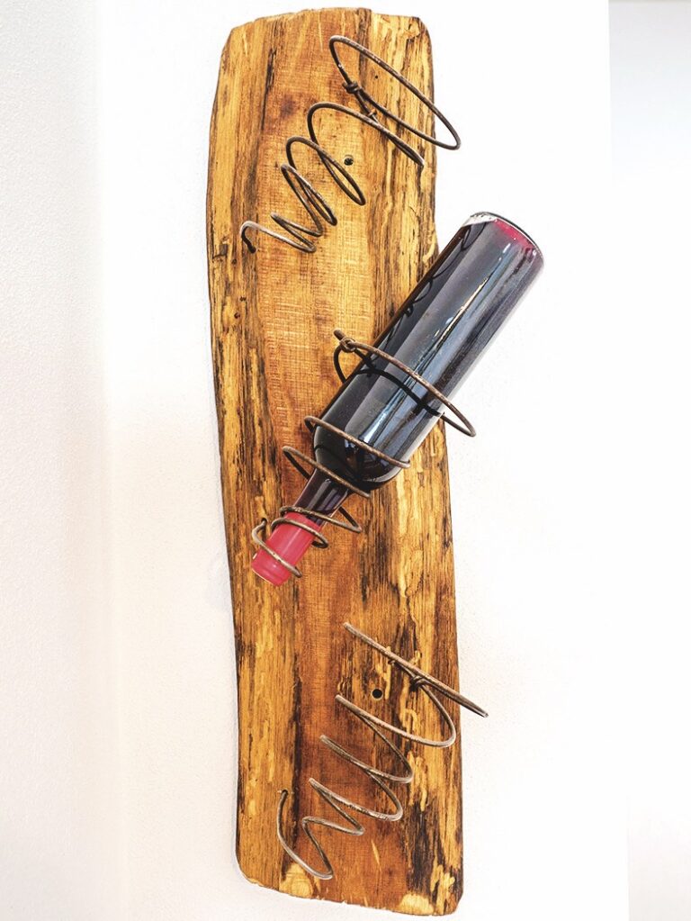 Vyrobte si šikovný držák na vína, který bude jako z dílny moderního umění. Nemusí dát přitom moc práce. Postačí kus dřeva o tloušťce deseti centimetrů a tři dráty, které stočíte do spirály.