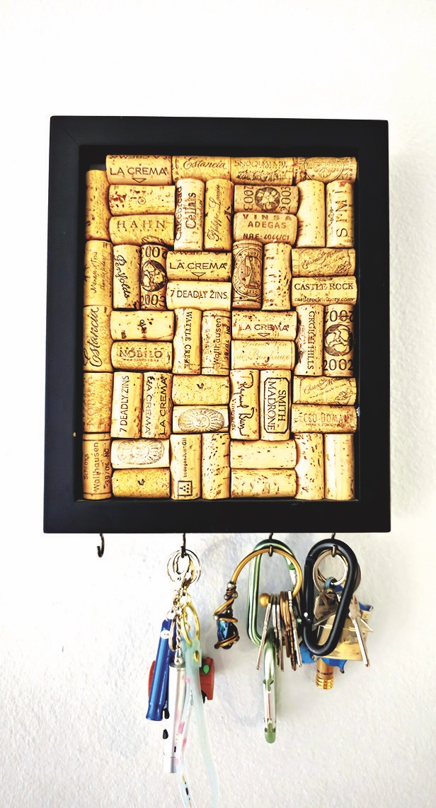 Šanci dostanou korkové zátky od vína! Nejjednodušší bude vzít hotový širší rám na obrázek a plochu polepit zátkami. Do spodní lišty navrtejte čtyři háčky. Vzniklou dekoraci pověste na zeď. Na háčky můžete zavěsit, co potřebujete.