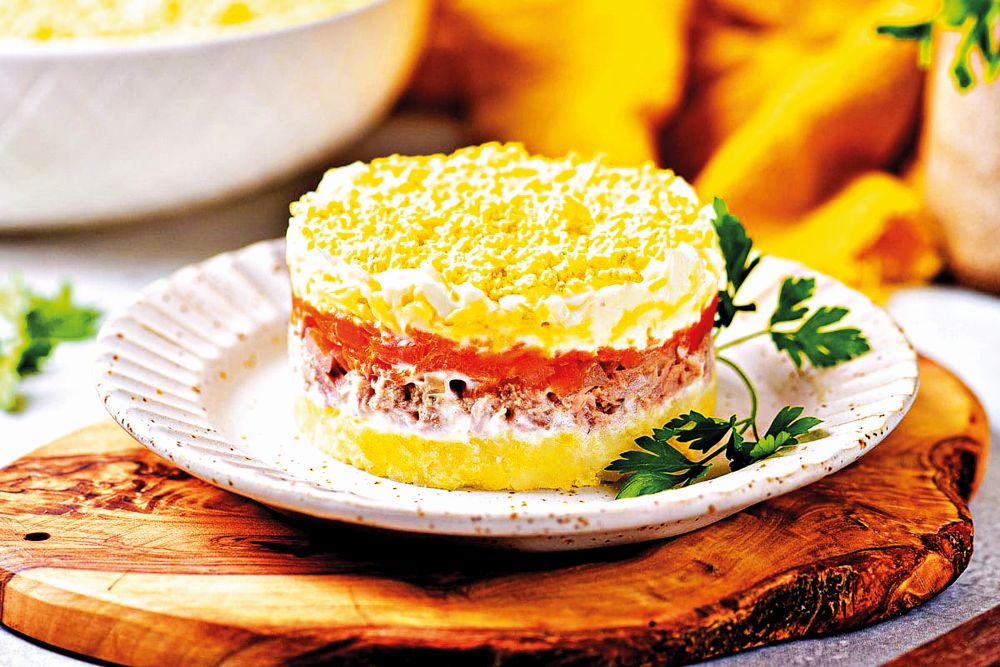 Salát můžete vrstvit do dortové formy a před podáváním ho vyjmout.