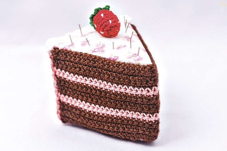 Další tip, jak vyrobit jehelníček, kterému nebude chybět vtip! Polštářek do šití v designu háčkovaného čokoládového dortíku s jahůdkou navrchu. Jehly pak budete zapichovat do horní části, kterou tvoří látka.