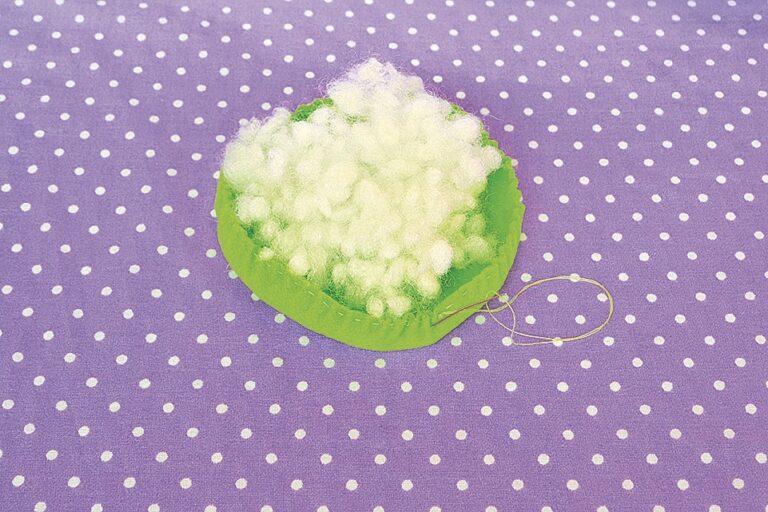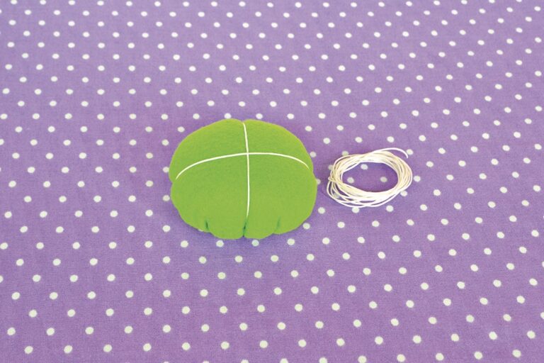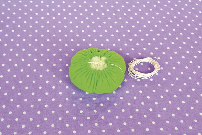 3) Lehce stáhněte šňůrku, aby vznikla mělká jamka, a vyplňte ji PES výplní. Šňůrkou stáhněte a zavažte na uzlík. Vzniklý otvor zakryjte ještě kolečkem látky, které přišijete.