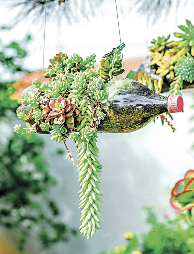 Plastové PET lahvi můžete přidat hodnotu i tím, že z ní vytvoříte závěsný truhlík pro sukulenty. V nádobě vystřihněte podélný otvor, na vrchu provrtejte dírky, kterými protáhnete provázky. Lahev naplňte hlínou a zasaďte do ní netřesky. Takto „rozkvetlou“ lahev zavěste třeba na balkon.
