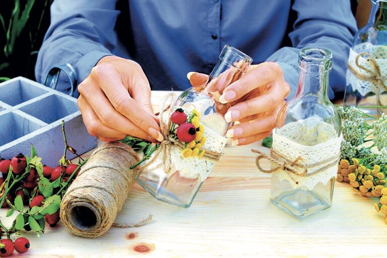 Menší čirou lahvičku můžete však i jednoduše dozdobit krajkovým pásem, který připevníte lepidlem. Hezky to bude vypadat ovázané jutovým provázkem, dozdobené třeba šípky nebo sušeným heřmánkem. Tahle vázička udělá parádu sama o sobě.