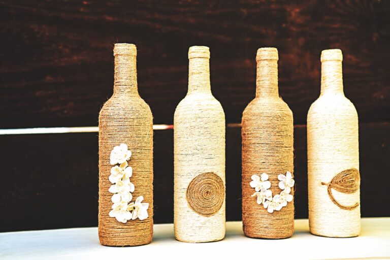 PET lahvím ve tvaru klasických lahví na víno bude slušet takovýto kabátek z jutových provázků. Ty na ně upevněte pomocí lepidla. Pro lepší stabilitu lahve ještě naplňte pískem.
