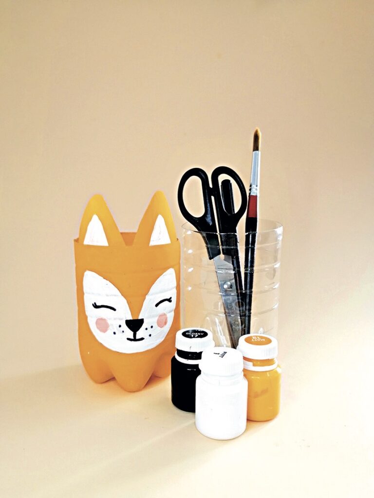 Zhotovte si takovouto liščí ozdobu na kancelářský stůl s praktickým využitím. Postačí vám k tomu litrová PET lahev, nůžky nebo odlamovací řezák a akrylové barvy. Veselý výtvor je zároveň nápaditý tip, jak si užít společné tvoření třeba s vnoučaty.