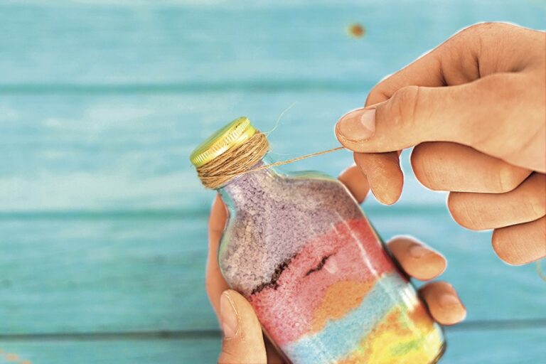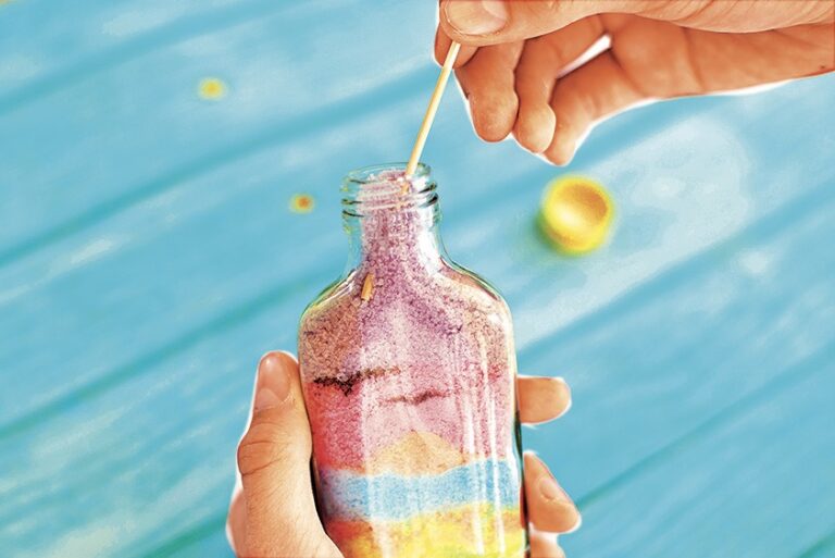 1) Tímhle výtvorem rozhodně zabodujete. K výrobě budete potřebovat menší, nejlépe hranatou plastovou lahev, špejli a dekorační písek v různých barvách.