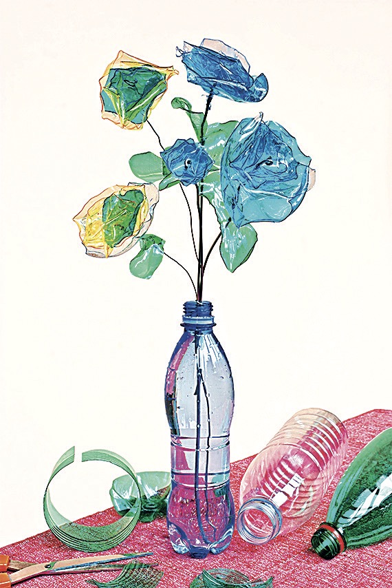 Ano, i taková nádhera se dá vyrobit z plastových lahví. Tentokrát se ale budou hodit ty barevné. Jednu použijte jako vázu a ze stěn zbylých vystříhejte nepravidelné útvary, které budou připomínat okvětní a zelené lístky. Ty následně napíchněte na dráty. Zasaďte do vázy, a je hotovo.