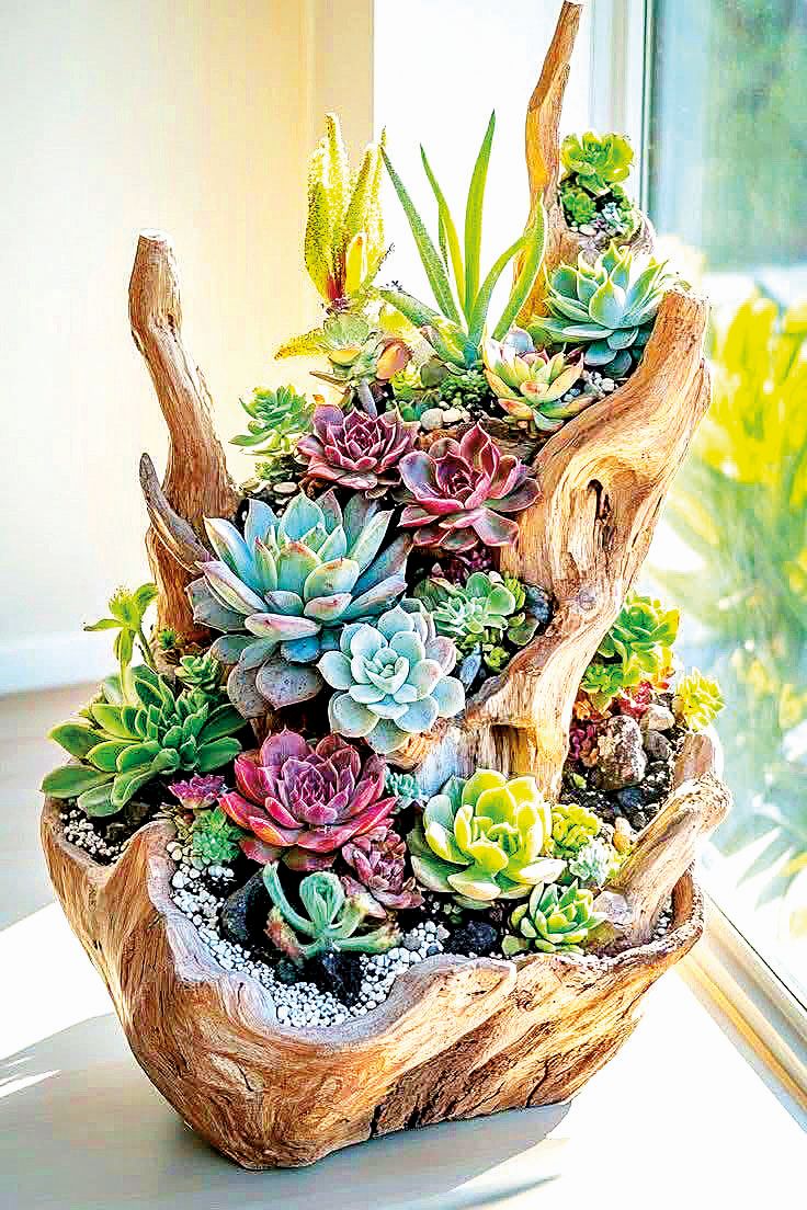 Pomocí vyplaveného dřeva si můžete doma udělat takovou malou skalku, která oživí například parapet. Osázet ho můžete nejen sukulenty, ale i jinými rostlinami, a to i kvetoucími. Fantazii se meze nekladou.