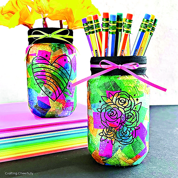 Nastříhejte si barevné papíry, klidně i barevný celofán, na čtverce 10 x 10 centimetrů. Potřete vnitřek kelímku průhledným lepidlem a pak ho vyložte ústřižky dle své fantazie.