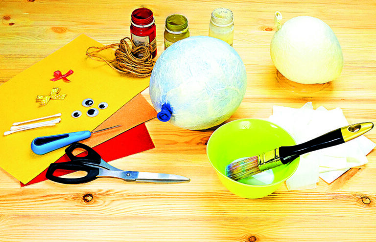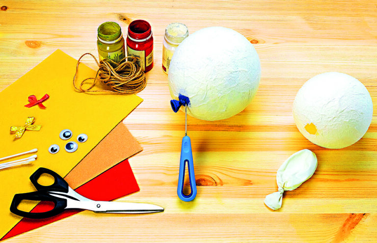 1) K ruce si připravte dva pouťové balónky, provázek, nůžky, štětec, misku, vodou ředitelné lepidlo, papíry, třeba novinové, a hrnek vody. Na dozdobení budete potřebovat plastová očička nebo mašličky či barevné papíry.