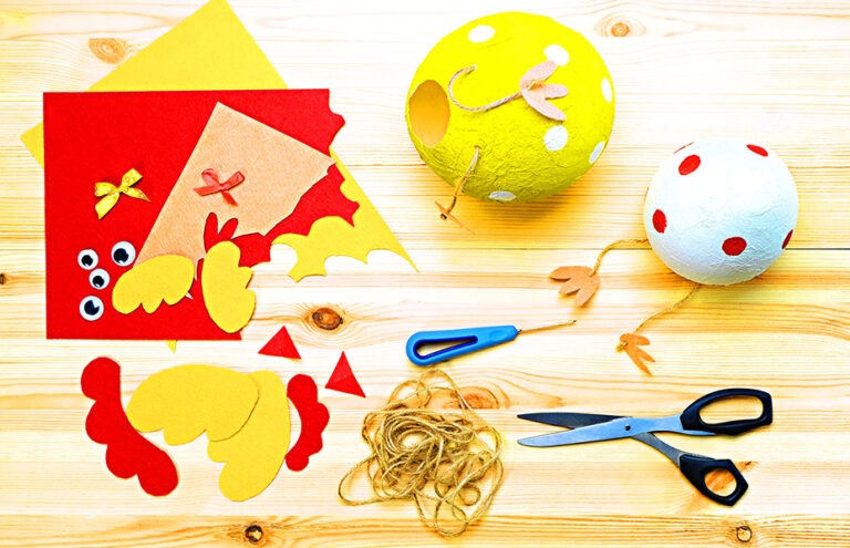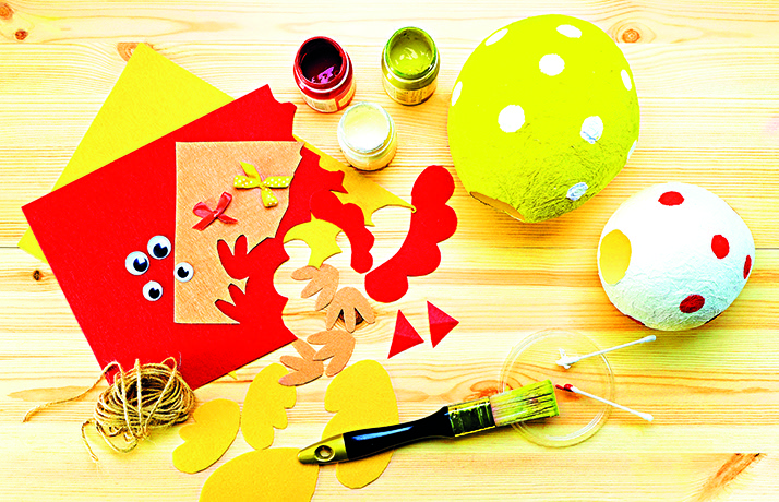 4) Vzniklé vyschlé útvary nabarvěte veselými odstíny a dozdobte nalepením prvků, jako jsou oči, hřebínek a křidélka vystřižená z papíru.