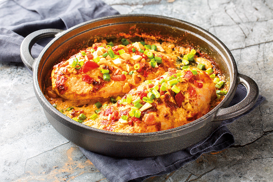 Pečte v troubě vyhřáté na 180 °C přibližně 25–30 minut, dokud nebude povrch zlatavý a omáčka lehce nezhoustne.
