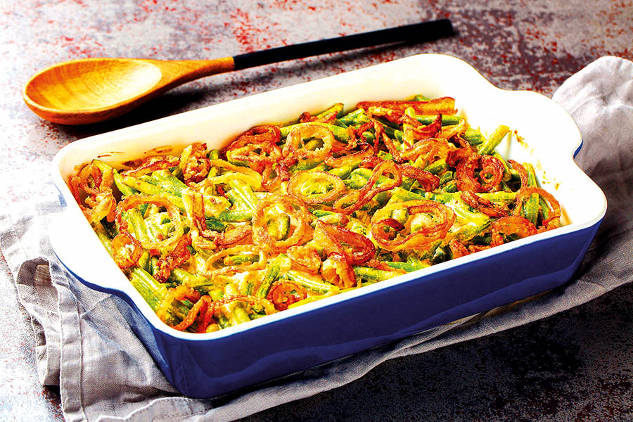 Nakonec fazolky posypejte křupavou cibulkou a ještě 5 minut dopečte.