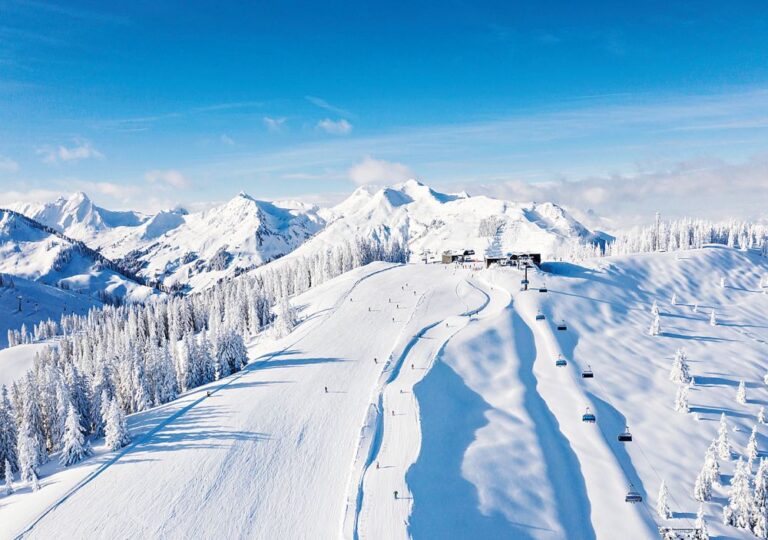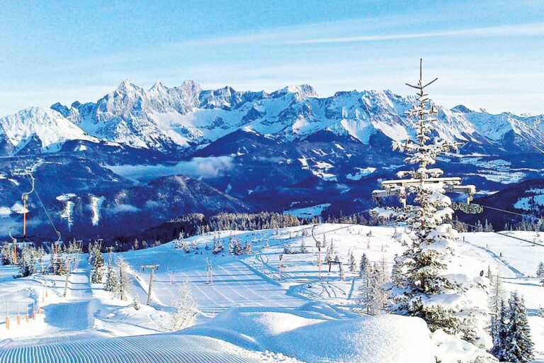 Dále také Dachstein West, hornorakouský region s perfektně upravenými sjezdovkami a krásným výhledem na zasněžené vápencové skály masivu Dachstein či Saalbach Hinterglemm Leogang Fieberbrunn.