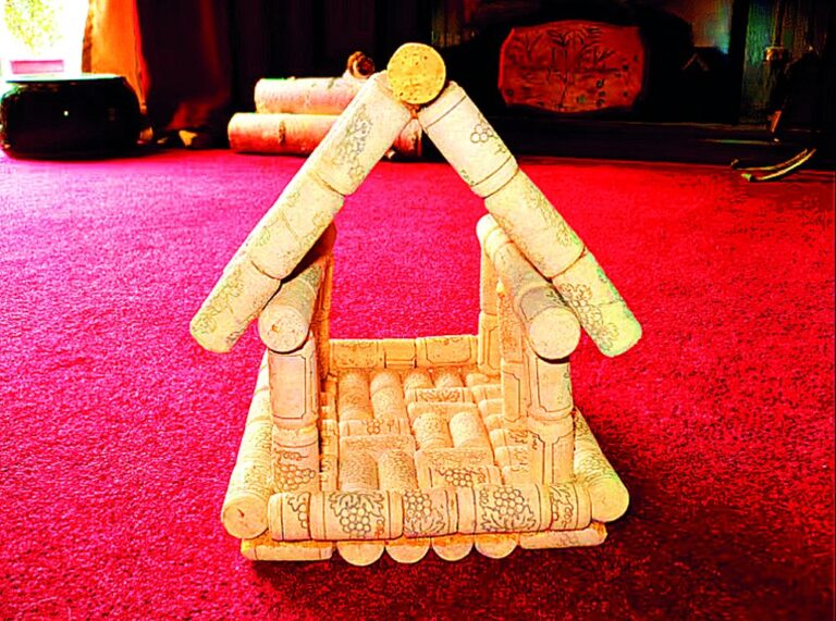 3. V rozích základního obdélníku vytvořte sloupy a dvě delší strany vyplňte korky. Každou vrstvu dobře připevněte k té předchozí tavnou pistolí. Jakmile budete mít hotové stěny, můžete přejít k výrobě střechy.