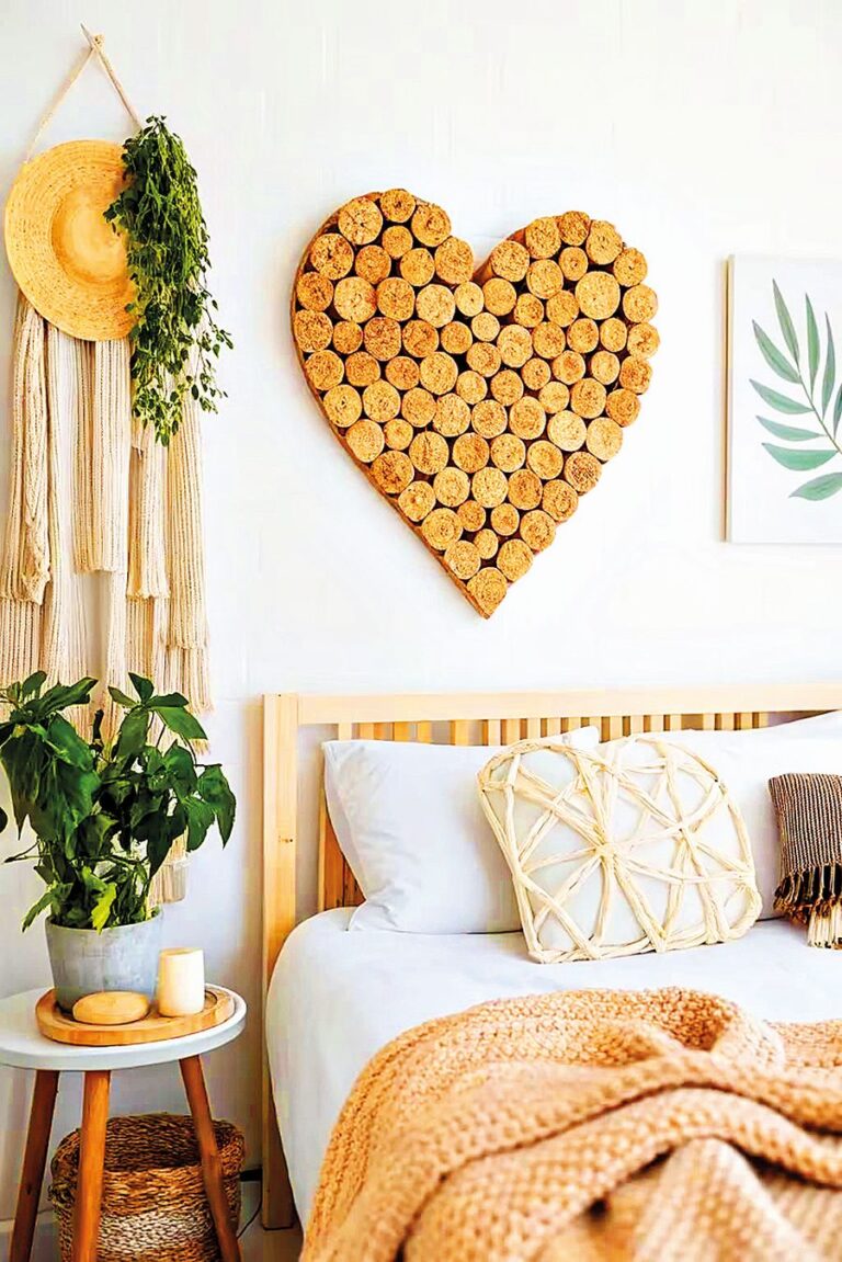 Poté ho nůžkami nebo nožem vyřízněte a univerzálním lepidlem na něj nalepte rozpůlené korky řezem k podkladu. Na závěr na dekoraci připevněte dva háčky a zavěste ji na zeď.