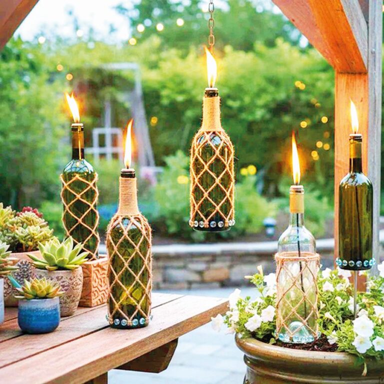 Pokud máte zahradu nebo terasu, tento návod vás určitě nadchne! Lahev od vína omyjte a asi do 2/3 ji naplňte lampovým olejem. Poté do lahve vložte knot tak, aby dosahoval na její dno.